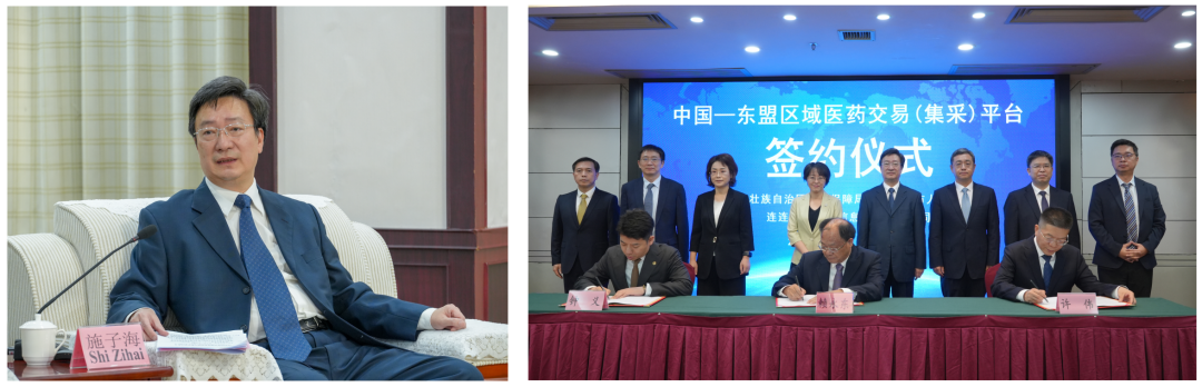 16日下午,施子海会见来邕参加中国—东盟区域医药交易(集采)平台推介会外宾,与外宾们就平台的发展合作和愿景进行了深入交流,得到了与会嘉宾的高度赞同。他表示,平台是面向东盟国家和上合组织国家开放的国际性区域医药服务贸易和结算平台,是国家医疗保障局指导地方建设的首个跨境区域医药交易(集采)平台,正成为中国医药出口东盟的“直通车”和“新窗口”。希望进一步建好用好平台,将其打造成为深化区域医保医疗医药健康合作的重要载体,为增进各国人民健康福祉作出积极贡献。他强调,要充分发挥广西面向东盟的区位优势,推动更多优质医药产品通过平台“走出去”,也把东盟特色药品“引进来”,切实服务区域民众健康需求。会见后见证了自治区医保局、防城港市人民政府与连连宝(杭州)信息技术有限公司签署战略合作协议。