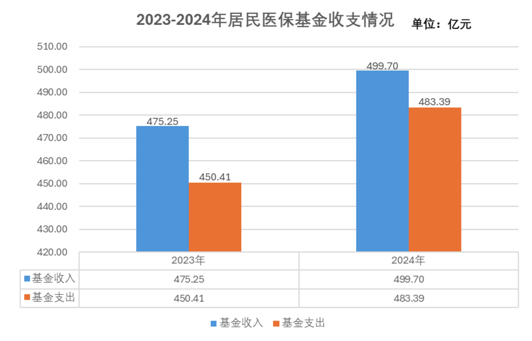 2.基金收支。2024年居民医保基金收入499.70亿元,基金支出483.39亿元,当期结存16.31亿元,累计结存448.27亿元。