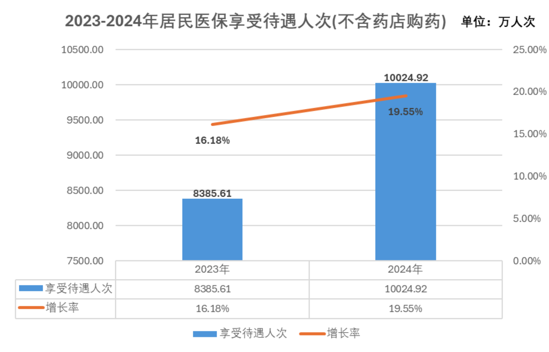 3.待遇享受。2024年参加居民医保人员享受待遇10060.15万人次,较上年增长19.34%,其中普通门(急)诊7248.74万人次,门诊慢特病1656.06万人次,住院1120.12万人次,药店购药35.23万人次。