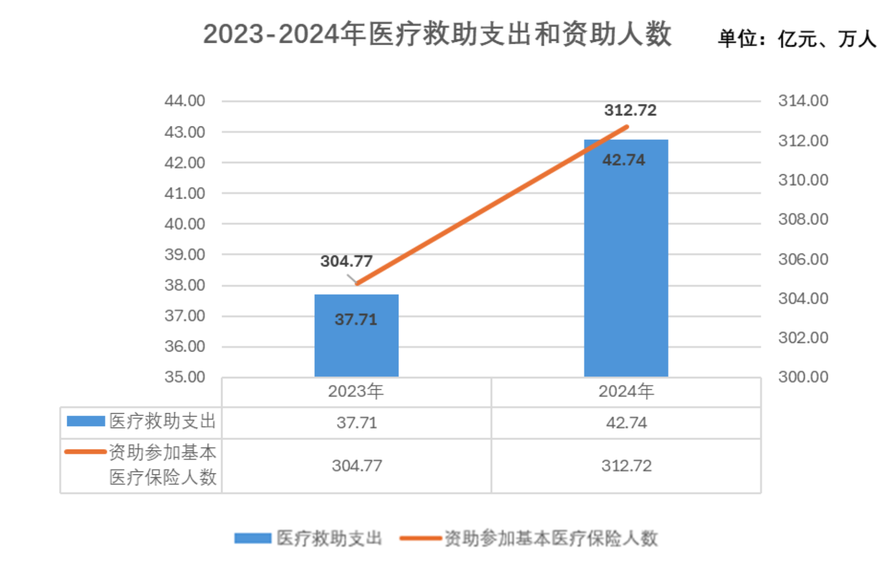 2024年全区医疗救助支出42.74亿元,医疗救助基金资助312.72万人参加基本医疗保险,实施门诊和住院救助635.26万人次,全区次均住院救助、门诊救助分别为1368元、122元。2024年中央财政安排医疗救助补助资金22.56亿元。(医疗救助基金资助参保人数不含其他部门资助参保人数)
