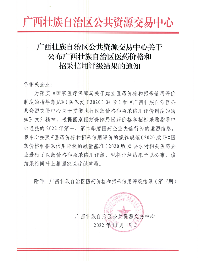 【信用评价】关于公布广西壮族自治区医药价格和招采信用评级结果的通知(第四期)
